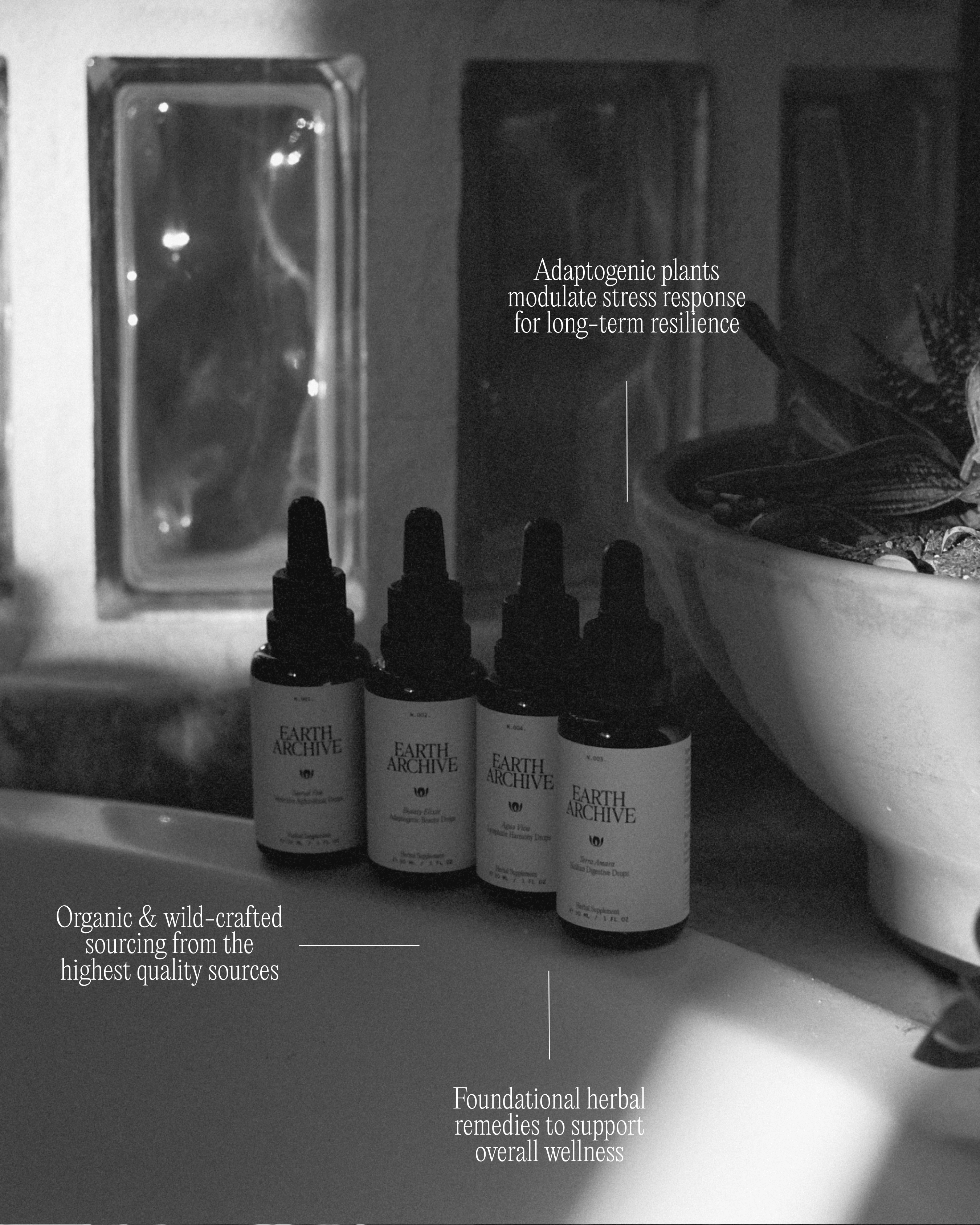 Our curated Herbal Remedy Collection includes our four signature tinctures, (001) Sacred Fire, (002) Beauty Elixir, (003) Terra Amara, and (004) Agua Viva, to offer a holistic approach in supporting the body's vital systems through the wisdom of plants. This set brings together formulas for skin and nervous system support, lymphatic flow, digestion and metabolism, and sensual vitality.